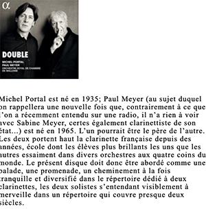 Absolument, c’est une figure incontournable de la musique depuis 50 ans en France, Michel Portal qui fête ce soir ses 85 ans. Une carrière absolument prodigieuse. Il a composé pour le cinéma, il a joué de la musique classique à très très haut niveau, dans les plus grandes salles du monde, mais qui a aussi été quelqu’un qui a inventé un concept qui pourrait s’appeler la musique buissonnière. On avait l’impression qu’il s’échappait de la musique sérieuse pour aller vivre une liberté absolue avec le jazz, mais tout en respectant avec le plus haut degré d’exigence possible la musique classique. Et Michel Portal, 85 ans ce soir, sort un disque absolument merveilleux de clarinette avec son ami Paul Meyer, qui a quelques dizaines d’années en moins. Ce sont les deux stars de la clarinette, et ils sortent un disque magnifique de musique classique, purement classique : Carl Philip Emanuel Bach, Stamitz, vraiment, c’est la clarinette dans tout ce qu’elle a de plus classique, de plus beau, et je vous propose d’en écouter un petit extrait. C’est deux maîtres de la clarinette »