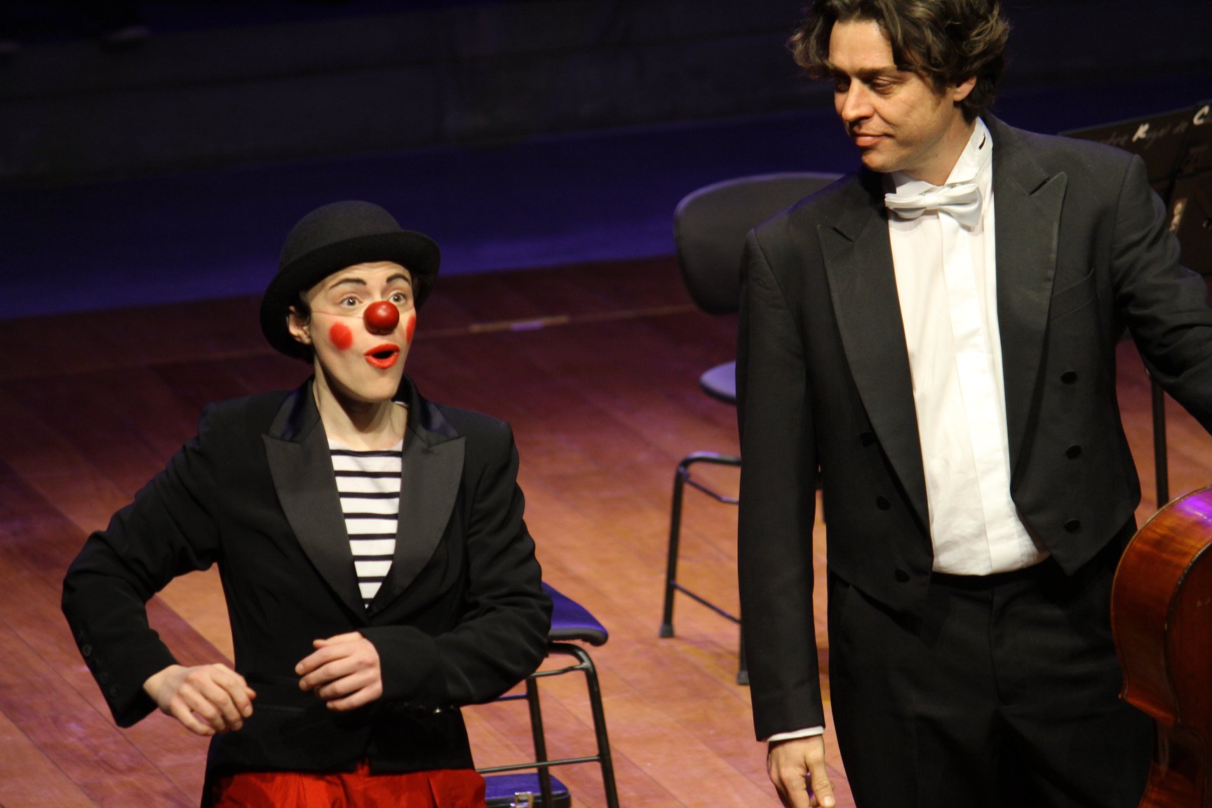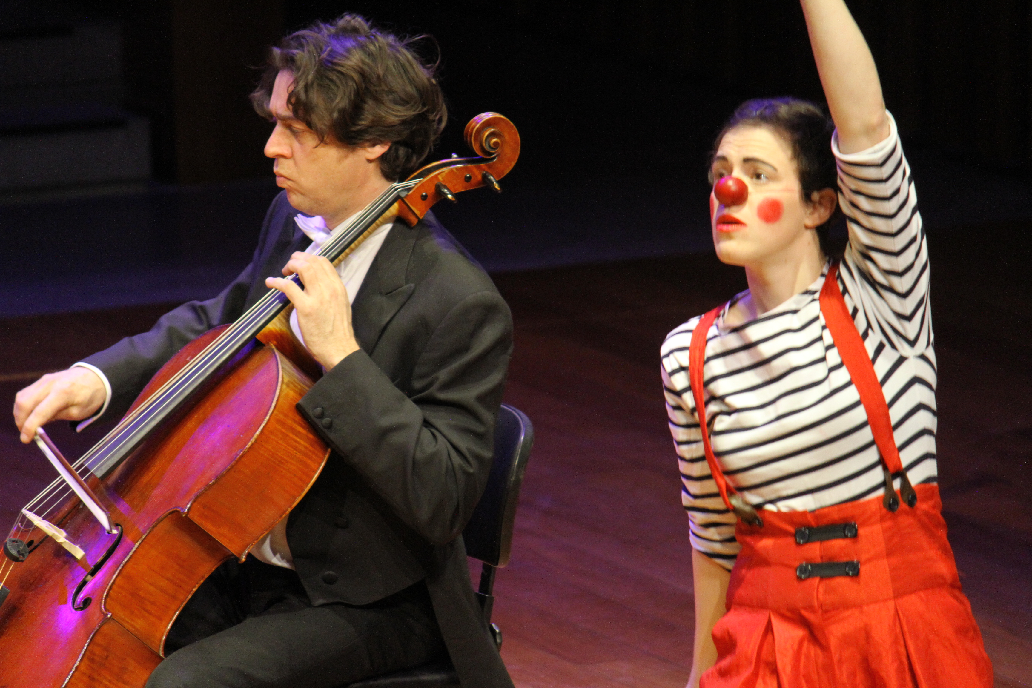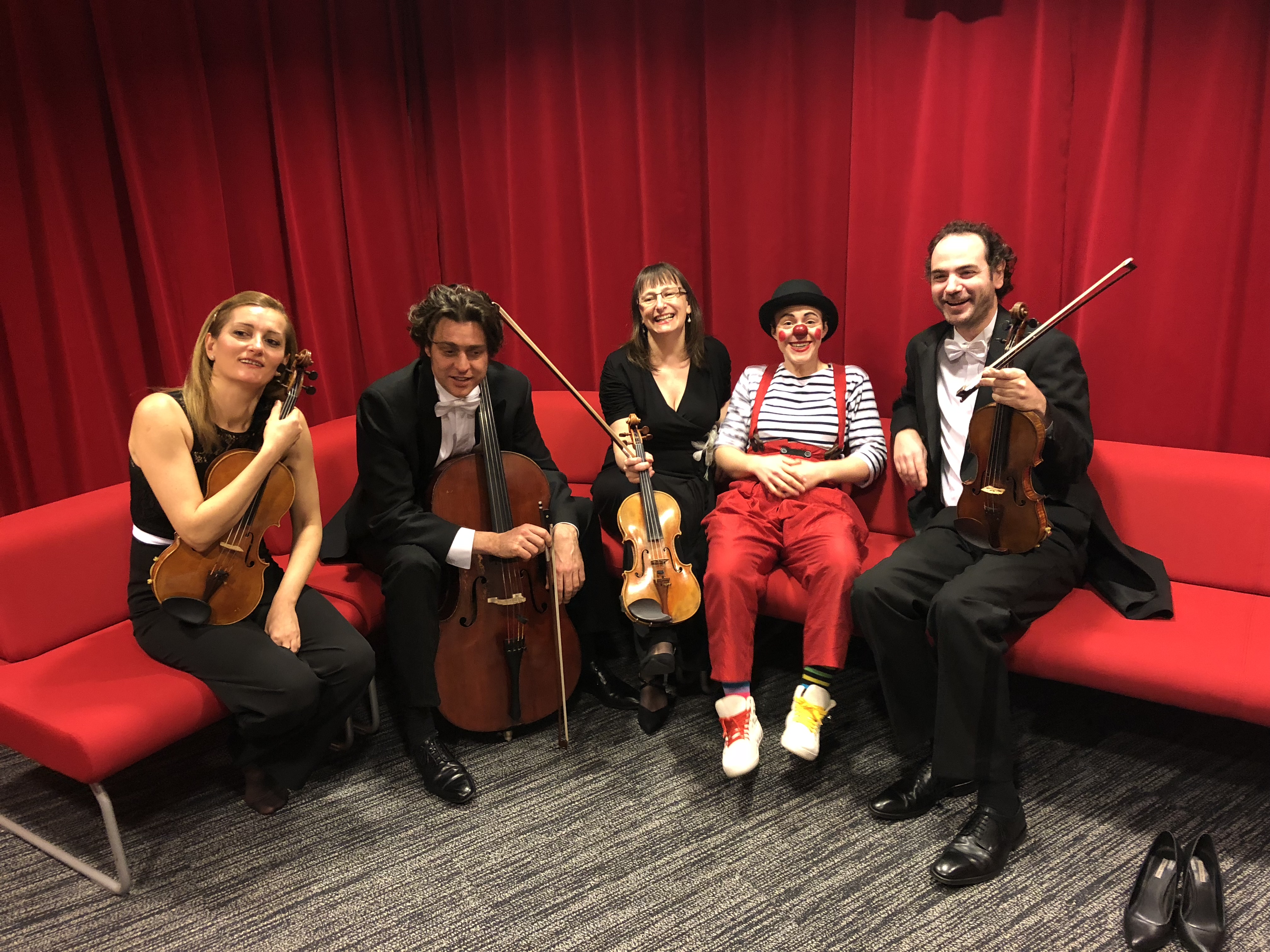 Les coups de cœur du clown pour des « instruments surprises » (cuillère à café, ukulélé, violon, klaxon, et d’autres instruments farfelus) viendront joyeusement compléter le quatuor en une fantaisie cacophonique, le métamorphosant en quintette inédit. Bach, Beethoven, Schubert ou encore Dvorak guideront le clown dans sa quête imaginaire de la musique, encadrant ses maladresses dans une alchimie imprévisible.