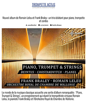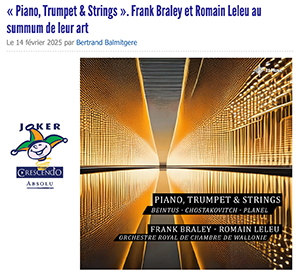 « Piano, Trumpet & Strings » encore un album magistral en 2025 ! Porté par l’excellence de Romain Leleu, Frank Braley et l’Orchestre Royal de Chambre de Wallonie, cet opus constitue un moment musical inattendu et exceptionnel.