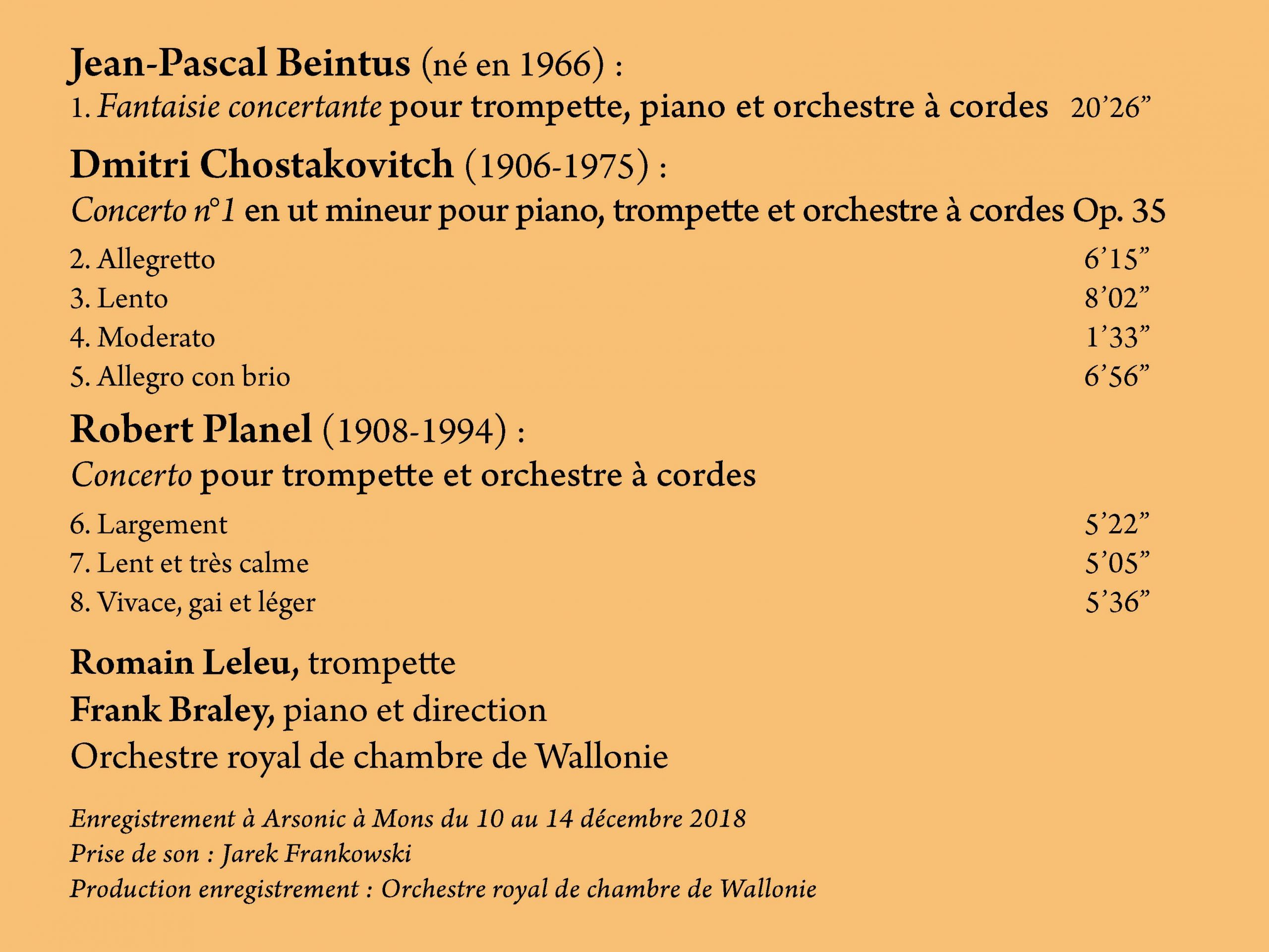 La musique française reste à l’honneur avec le Concerto pour trompette et orchestre à cordes de Robert Planel, composé en 1966 et dédicacé à Maurice André. Son style direct, coloré et agréable à l’oreille et merveilleusement écrit pour les instruments à vent et les cuivres est en droite ligne de l’école française à laquelle Jean-Pascal Beintus se rattache.