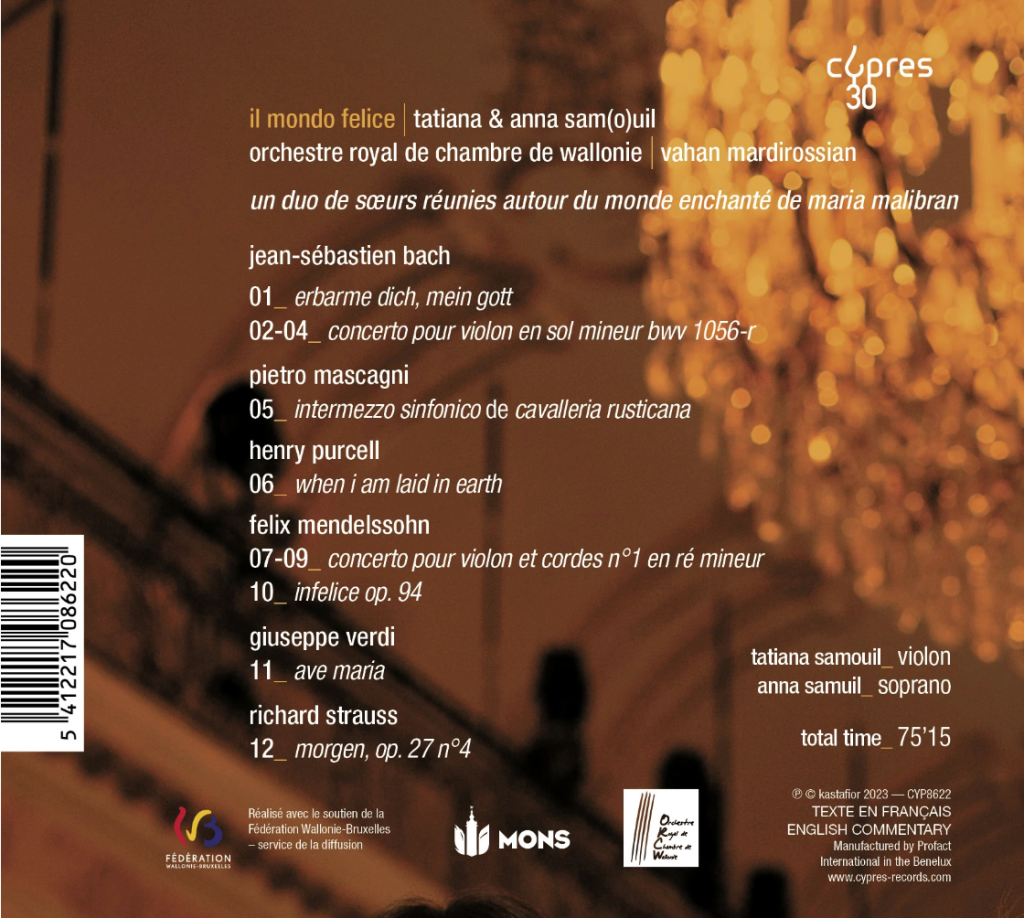 Cet enregistrement clôture la saison anniversaire des 30 ans du label Cypres. Comme un clin d’œil à Confidentes, première publication de cette collection qui mettait en avant un duo de sœurs talentueuses – Marie et Sophie Hallynck – ayant une longue histoire avec notre label, il est également question de sororité ici avec Tatiana et Anna Sam(o)uil qui concrétisent leur rêve d’enregistrer ensemble. Elles nous convient à leur monde enchanté, Il Mondo Felice, au travers de ce programme qui réunit la voix, le violon et un orchestre de chambre autour de l’artiste exceptionnelle qu’est Maria Malibran.
