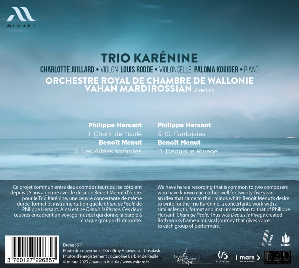 Ce projet de disque commun entre Philippe Hersant et Benoît Menut, deux compositeurs de générations différentes qui se côtoient depuis 25 ans, a germé avec le désir de Benoît Menut d’écrire, pour le Trio Karénine, une œuvre concertante de même durée, format et instrumentation que celle de Philippe Hersant, le Chant de l’isolé. Ainsi est né Depuis le Rivage.
