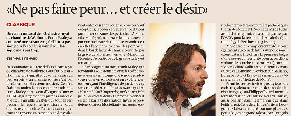 2017-02-14-BRALEY_ORCW–Lecho_Stéphane-Renard-1000X400 Publié 15 février 2017 à 1000 &fois; 400 dans L’Echo : « Ne pas faire peur… et créer le désir » Frank Braley a concocté une saison 2017 fidèle à sa passion pour l’école buissonnière.