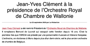 Jean-Yves Clément est président du conseil d’administration et de l’assemblée générale de l’Orchestre royal de chambre de Wallonie. » (Lire l’article)