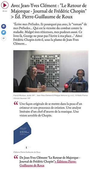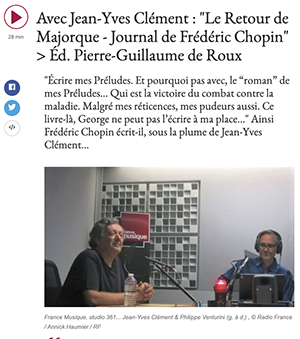 Le 5 septembre 2020, Philippe Venturini, dans l’émission « Sous la couverture » qu’il présente sur France Musique, recevait Jean-Yves Clément à l’occasion de la sortie de son livre « Le Retour de Majorque – Journal de Frédéric Chopin », Éd. Pierre-Guillaume de Roux