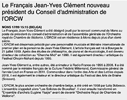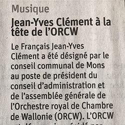 Jean-Yves Clément est président du conseil d’administration et de l’assemblée générale de l’Orchestre royal de chambre de Wallonie. » (Lire l’article)
