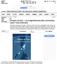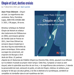 « Directeur artistique du Festival Chopin de Nohant et créateur des Lisztomania de Châteauroux en 2002, commissaire général de l’année Liszt en France en 2011, Jean-Yves Clément se consacre depuis longtemps à ces deux figures essentielles du piano romantique. Entre autres ouvrages les concernant, cet originaire de Bourges a écrit Nuits de l’âme. 21 poèmes d’après les 21 Nocturnes de Frédéric Chopin (Le Cherche-Midi, 2010), ajoutant à sa réflexion sur la création musicale sa propre vision lyrique. Cette fois, il propose un essai au sein duquel, selon le splendide sous-titre de son livre, « la magnificence des contraires », il aborde la personnalité de Liszt, extraverti et public, et celle de Chopin, intérieur et solitaire, pour souligner le fait que ces deux génies, à la fois si distincts et si symétriques, semblent se compléter et s’emboîter dans le ciel mystérieux de l’art. » (Lire l’article)