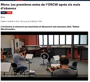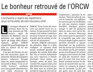 « La musique résonne à nouveau dans les Iocaux montois de l’Orchestre Royal de Chambre de Wallonie, Les répétitions ont repris lundi, après six longs mois d’interruption. Jamais l’ORCW n’avait été aussi longtemps réduit au silence en 62 ans d’existence. C’est peu de l’écrire, les mines des musiciens ayant retrouvé le chemin des pupitres étaient radieuses lorsque nous les avons rencontrés ce mercredi à Mons (…) L’ORCW retrouvera la scène à Waterloo pour commencer, mais d’autres dates suivront., notamment à Arsonic à Mons. »